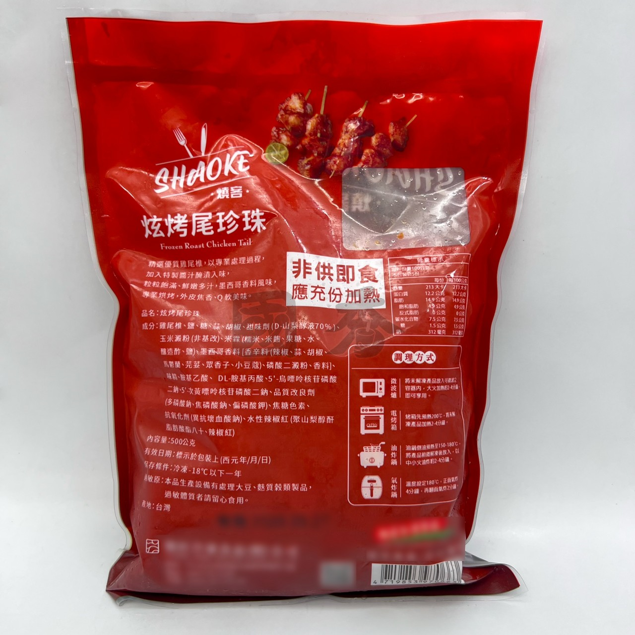成分:雞尾椎、鹽、糖、蒜、胡椒、甜味劑(D-山梨醇液70% )、玉米澱粉(非基改)、米霖(糯米、米麴、果糖、水、釀造酢、鹽)、墨西哥香料(香辛料(辣椒、蒜、胡椒、馬鬱蘭、芫荽、眾香子、小豆蔻)、磷酸二澱粉、香料)、味精、胺基乙酸、DL-胺基丙酸、5'-鳥嘌呤核苷磷酸二鈉、5'-次黃嘌呤核苷磷酸二鈉、品質改良劑(多磷酸鈉、焦磷酸鈉、偏磷酸鉀)、焦糖色素、抗氧化劑(異抗壞血酸鈉)、水性辣椒紅(聚山梨醇酐脂肪酸酯八十、辣椒紅)