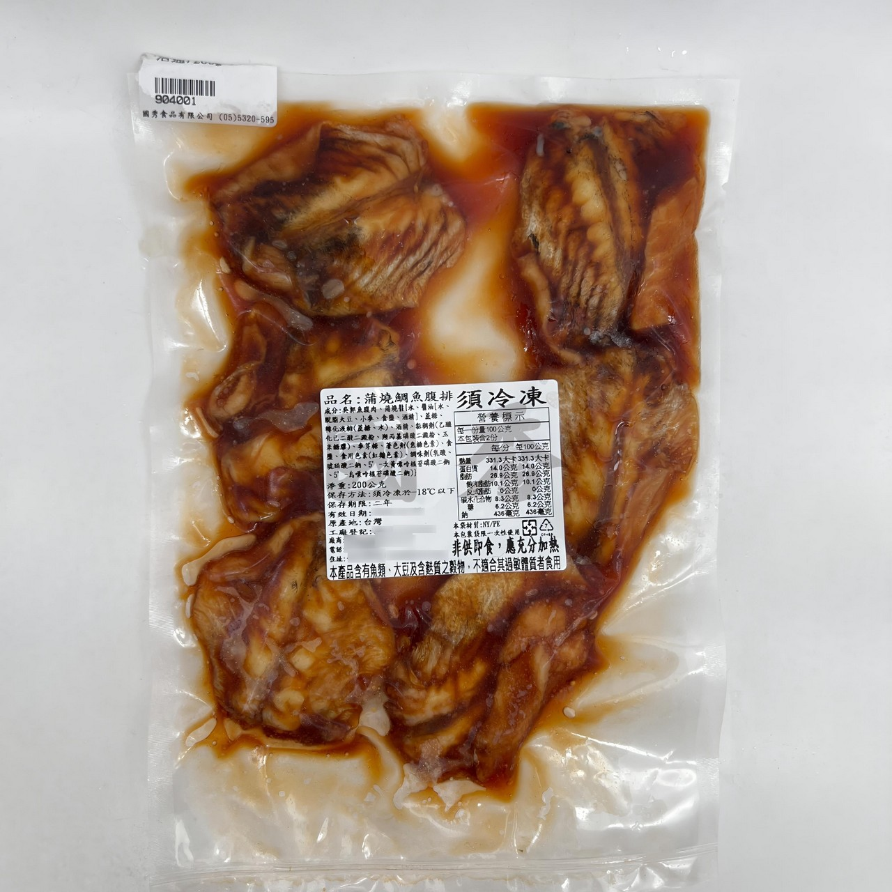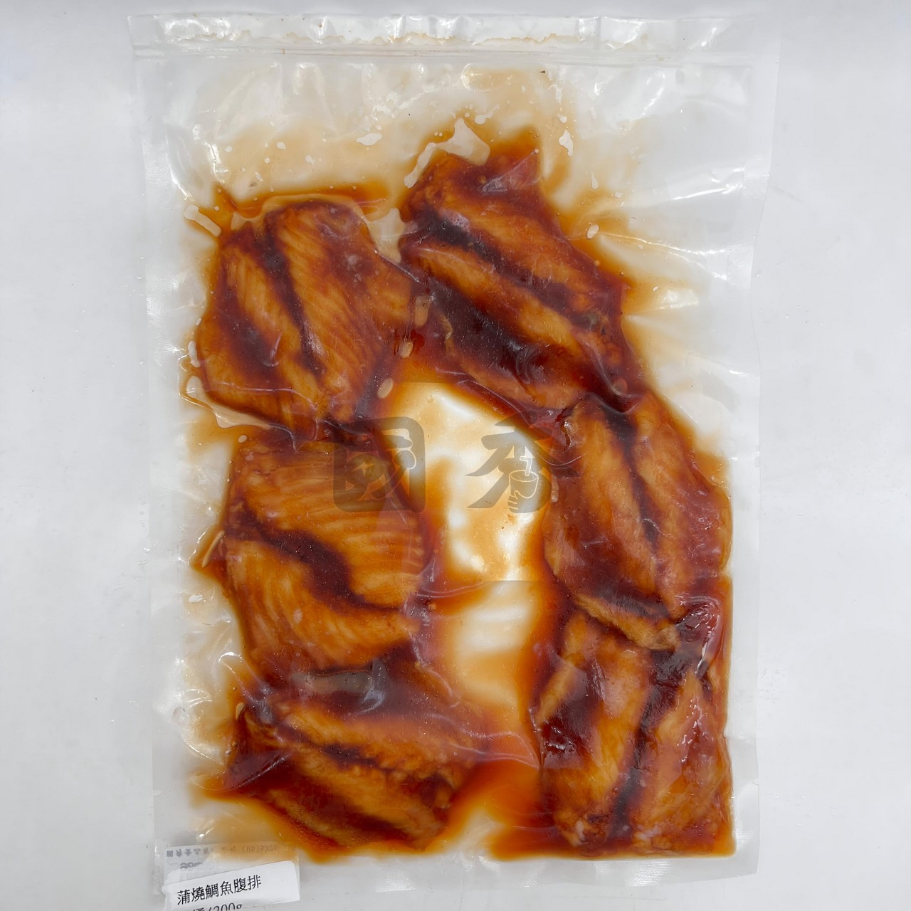 成分: 鯛魚腹肉、蒲燒醬{水、醬油[水、 脫脂大豆、小麥、食鹽、酒精]、蔗糖、 轉化液糖(蔗糖、水)、酒精、黏稠劑(乙醯 化己二酸二澱粉、羥丙基磷酸二澱粉、玉 米糖膠)、麥芽糖、著色劑(焦糖色素)、食 鹽、食用色素(紅麴色素)、調味劑(乳酸、 琥珀酸二鈉、5’-次黃嘌呤核苷磷酸二鈉 、5’-鳥嘌呤核苷磷酸二鈉)